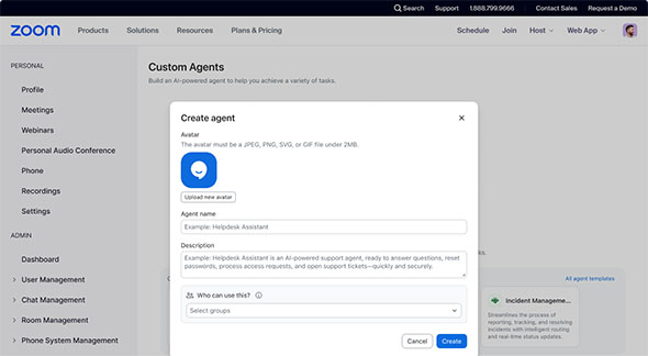 ● Los agentes de IA personalizados en Zoom AI Studio permitirán a los administradores de TI configurar bases de conocimiento y herramientas para probar las capacidades del agente de IA antes de que se despliegue (previsto para septiembre de 2025). El creador de agentes también contará con configuración de herramientas plug-and-play y funcionalidad de construcción mediante soporte de Model Context Protocol (MCP).