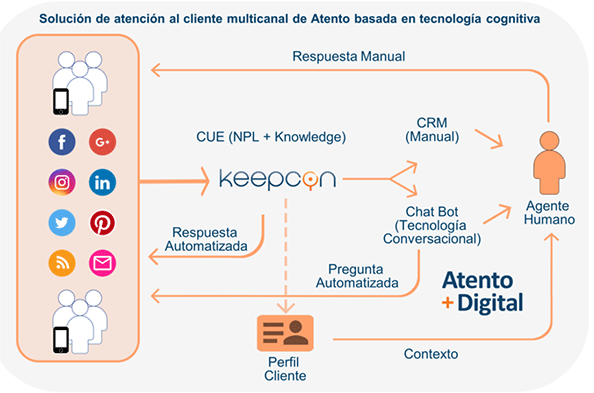 Un claro ejemplo de esta tecnología cognitiva es la solución de customer care cognitivo de Atento que combina la tecnología semántica de Keepcon con la plataforma omnicanal de atención al cliente de Atento para responder de forma automatizada y en tiempo real a demandas rutinarias del cliente a través de cualquier canal de interacción, incluido las redes sociales.