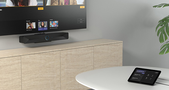 EXPAND Vision 5 puede utilizarse en combinación con la tableta EXPAND Control. Diseñada con doble funcionalidad, la tablet puede emplearse como gestora de la sala de reuniones para incorporarse a reuniones, ajustar la configuración de llamadas o compartir contenido; y a modo de panel, lo que permite realizar reservas de la sala de reuniones, comprobar la disponibilidad de la misma y consultar detalles de la reunión.