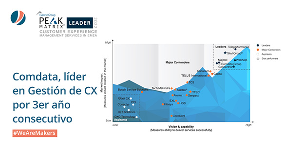La calificación de Líder otorgada a Comdata para el segmento de Gestión de la Experiencia del Cliente (CMX) es el resultado de los logros alcanzados por la compañía tras el desarrollo de su oferta en las soluciones más vanguardistas del mercado de CX BPO, como los chatbots, el chat en vivo, Facebook Messenger, las herramientas para obtener el feedback del cliente y la analítica del habla.