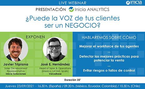 En este webinar participan Javier Tripiana, sales development representative de Inicia Soluciones, y José E. Hernández, head of sales and operations de VoiceBase Inc., quienes hablarán sobre cómo: