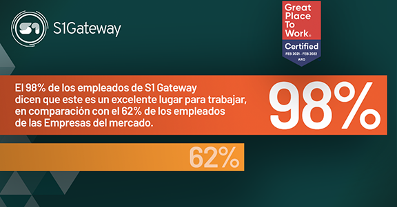 La compañía S1Gateway ha logrado la certificación Great Place to Work. Este certificado avala el buen ambiente laboral de la organización, donde el 98% de sus empleados la consideran un excelente lugar para trabajar. Este es un porcentaje bastante elevado en comparación con la media de otras empresas del mercado, que se sitúa en el 62%.