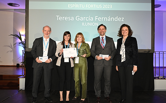 En la última edición de los Premios Fortius, el galardón de la categoría Espíritu Fortius, recayó en Teresa García, responsable de Unidades de Apoyo de ILUNION Contact Center BPO, quien recogió el galardón, acompañada por la directora de Gestión de Personas y Desarrollo del Talento de ILUNION Contact Center BPO, Nuria Díaz.