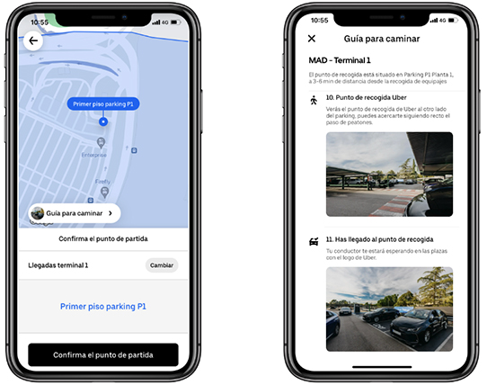 Otra de las nuevas funcionalidades consiste en la implementación de una guía paso a paso que incluye fotos de las distintas áreas del aeropuerto para llevar al usuario desde su puerta de embarque hasta el punto de recogida de Uber, contribuyendo a reducir el tiempo de inactividad de los conductores y la congestión en los aeropuertos y a aumentar la eficiencia del servicio. Esta función llega a Madrid-Barajas como uno de los primeros 30 aeropuertos del mundo en contar con ella, y se extenderá a otros aeropuertos en los próximos meses.